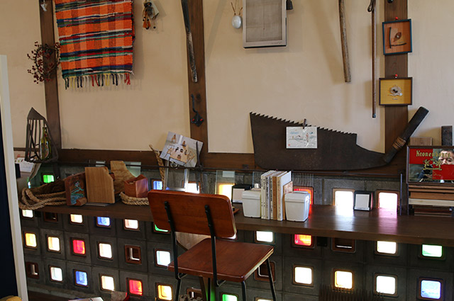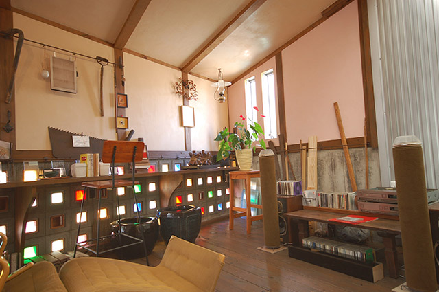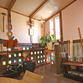建築工房カナヤ 改修 Type 事務所 Comment 自社事務所の改修です。漆喰の壁、ステンドグラス等でカナヤらしさを表現してみました。机の上の巨大なノコギリは昔の職人さんが実際に使われていたものです。
